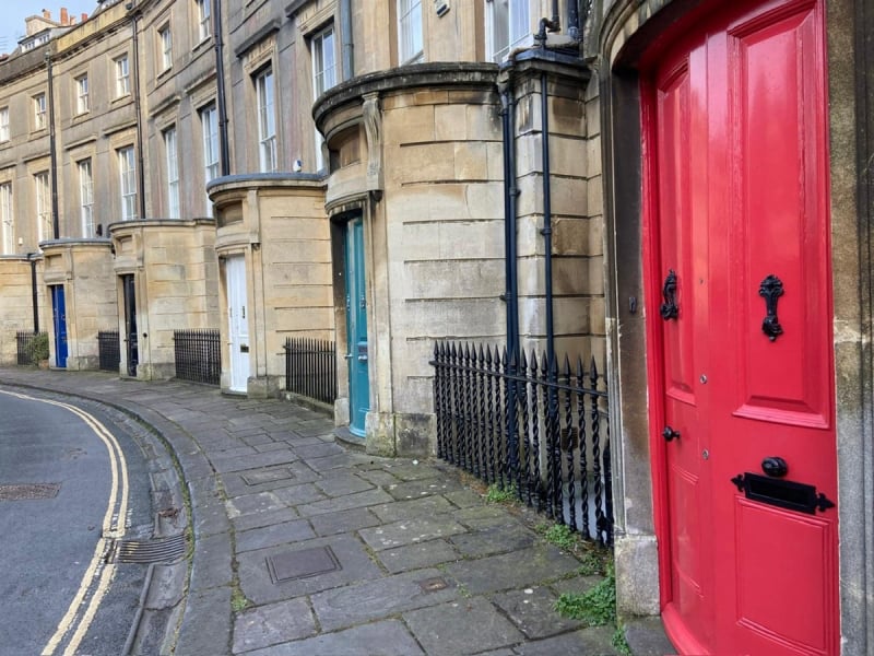 Proceeding along North Road we enjoyed good views of Avon Gorge and across to the Clifton Observatory. Having crossed the Clifton Suspension Bridge our route took us past Clifton Rocks Railway which had linked Clifton to Hotwells from 1893 till its closure in 1934. During WW2 it was used as a secret transmission base by the BBC . We then paused to look at the distinctive Grade 2 listed Georgian houses in the Paragon. Built with Bath stone between 1809-1814 each front door being curved and of a different colour to the others.